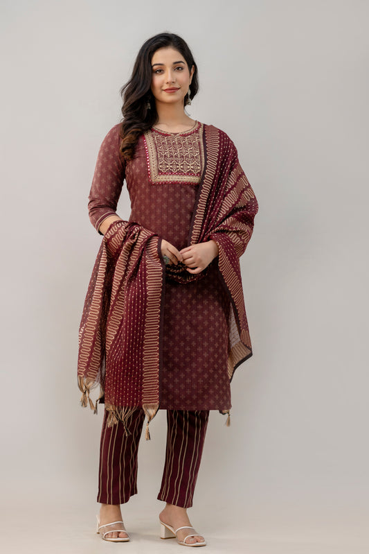 Geometric Woven Design Straight Kurta Pant Dupatta Set
