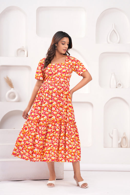 Women Floral Print Layered Knee Length Dress